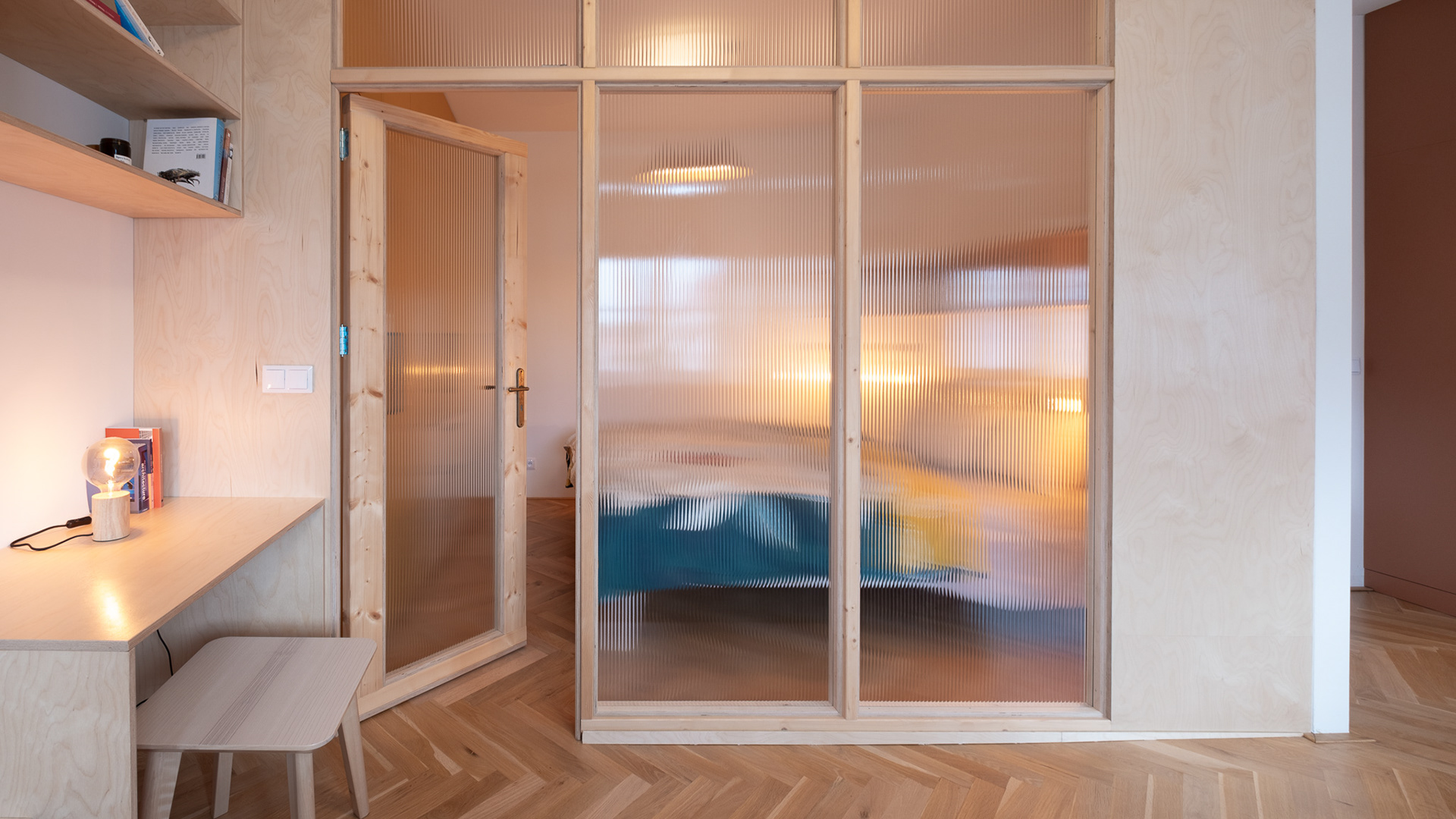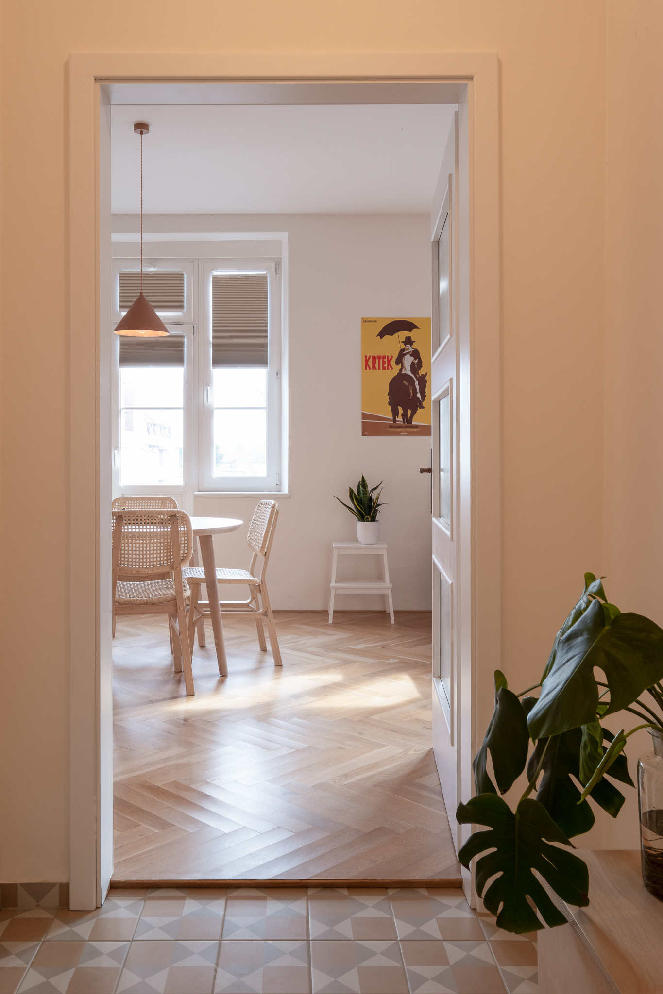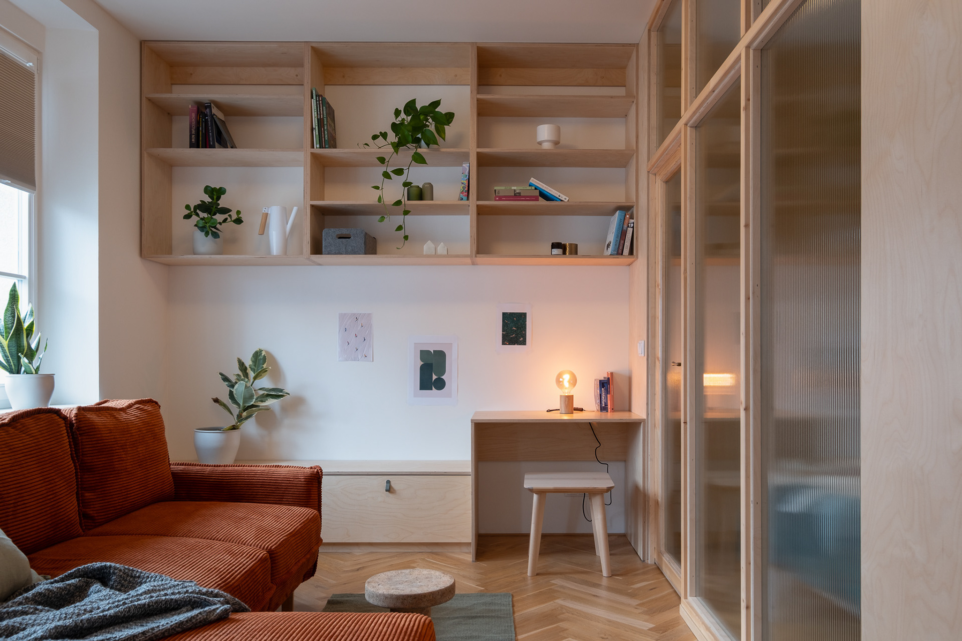 Rekonstrukce malometrážního bytu 1+1 nad kinem Aero vycházela z redukce původní dispozice. Zbouráním příčky mezi kuchyní a obytným prostorem došlo k otevření bytu do jednoho kompaktního, prosvětleného celku. Spací část byla vymezena nábytkovou prosklenou stěnou, která umožnila její oddělení bez ztráty denního světla. Ložnice zaujala pouze minimální potřebnou plochu – s místem pro lůžko a vestavěnou skříň sloužící jako hlavní úložný objem bytu. Dispoziční zásah tak maximalizoval prostorový potenciál malometrážního bytu při zachování jeho vzdušnosti a světelné kontinuity.
