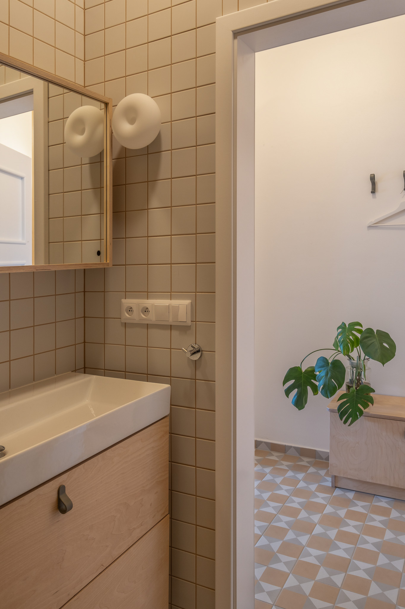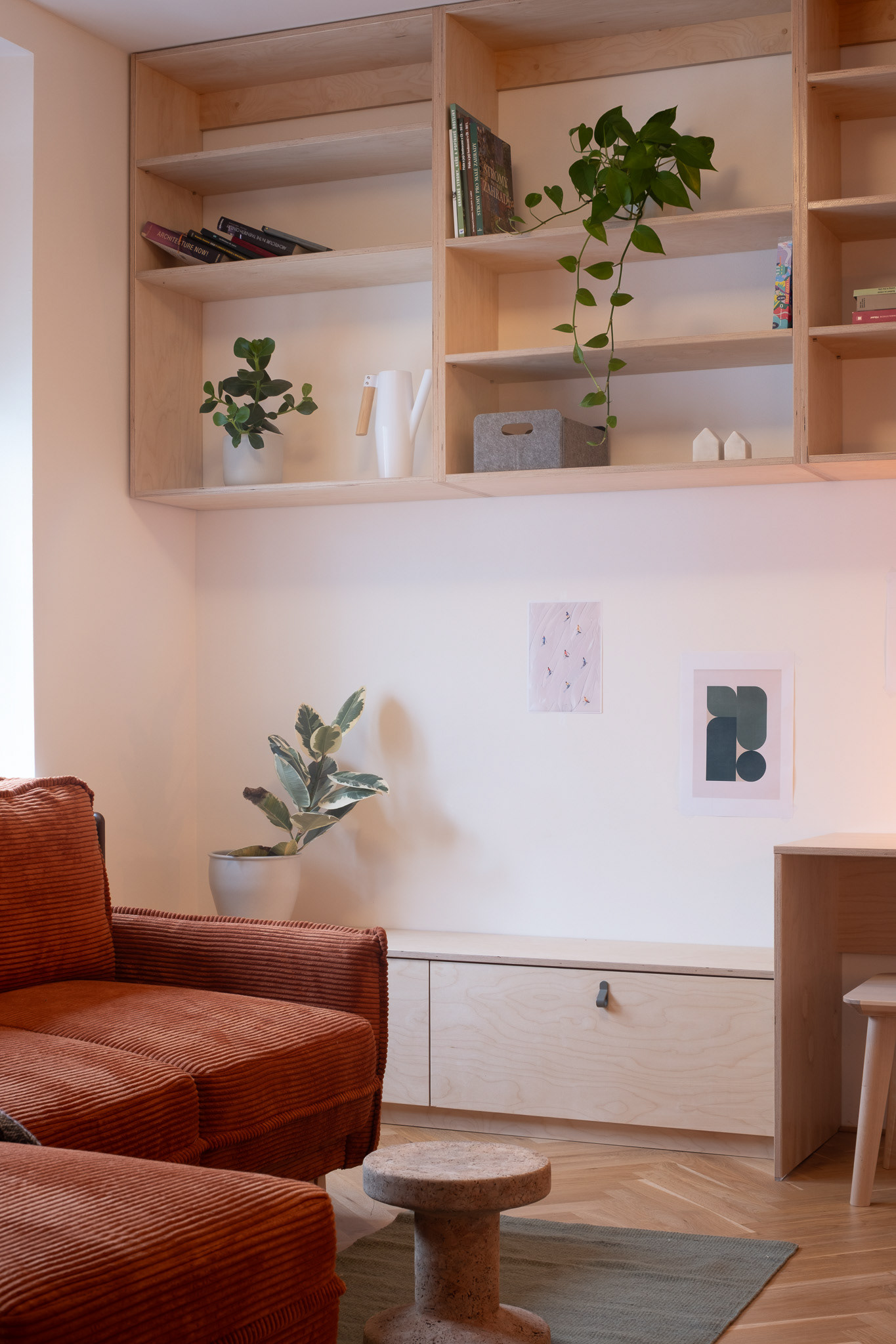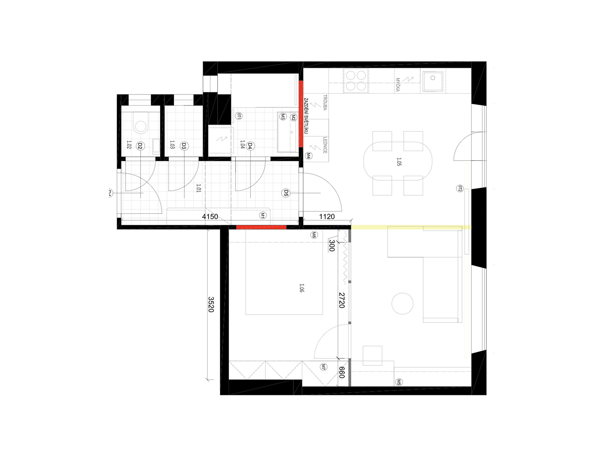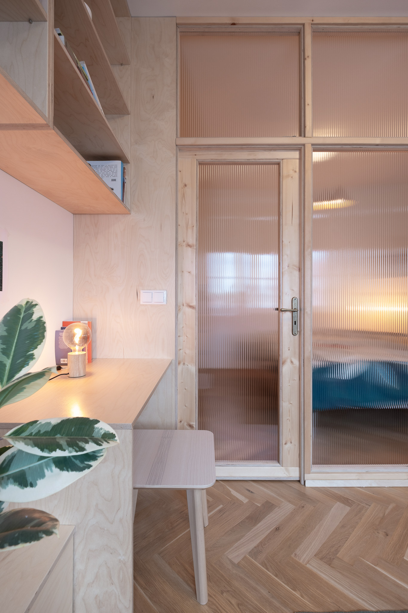 Rekonstrukce malometrážního bytu 1+1 nad kinem Aero vycházela z redukce původní dispozice. Zbouráním příčky mezi kuchyní a obytným prostorem došlo k otevření bytu do jednoho kompaktního, prosvětleného celku. Spací část byla vymezena nábytkovou prosklenou stěnou, která umožnila její oddělení bez ztráty denního světla. Ložnice zaujala pouze minimální potřebnou plochu – s místem pro lůžko a vestavěnou skříň sloužící jako hlavní úložný objem bytu. Dispoziční zásah tak maximalizoval prostorový potenciál malometrážního bytu při zachování jeho vzdušnosti a světelné kontinuity.