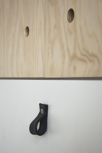 Dětský pokoj je navržen velmi pragmaticky. Skříňová sestava opět z překližky je doplněna otevřeným kovovým regálem, na který pod oknem navazují dva propojené psací stoly.